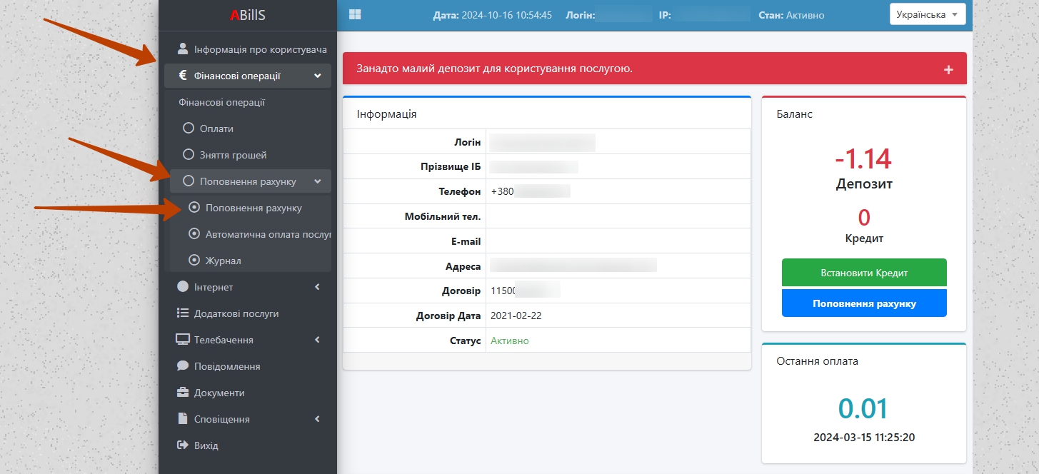 Після здійснення платежу, кошти повинні бути зараховані на Ваш баланс, який ви можете перевірити у Особистому кабінеті в розділі Фінансові операції/Оплати.